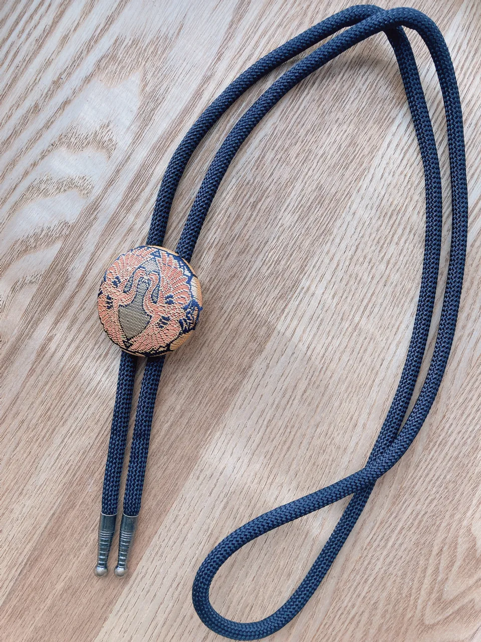長寿の象徴とされる鶴と亀の甲羅の柄が入った金襴生地を使ってくるみボタンのループタイにしました♪